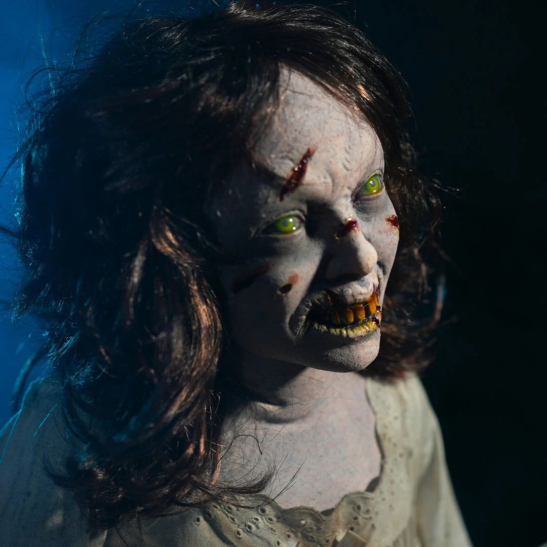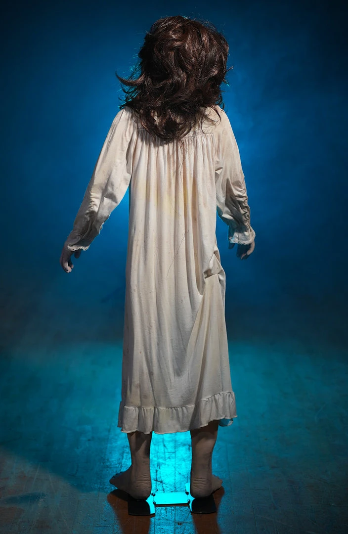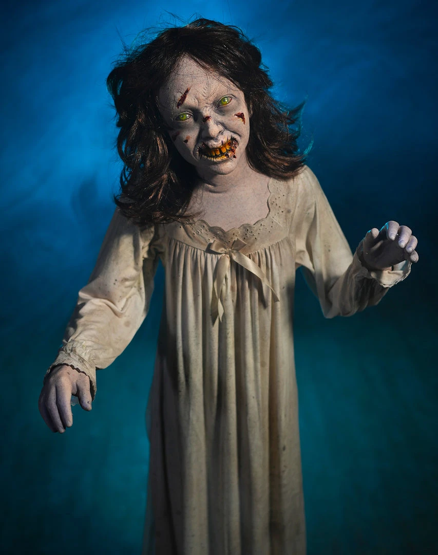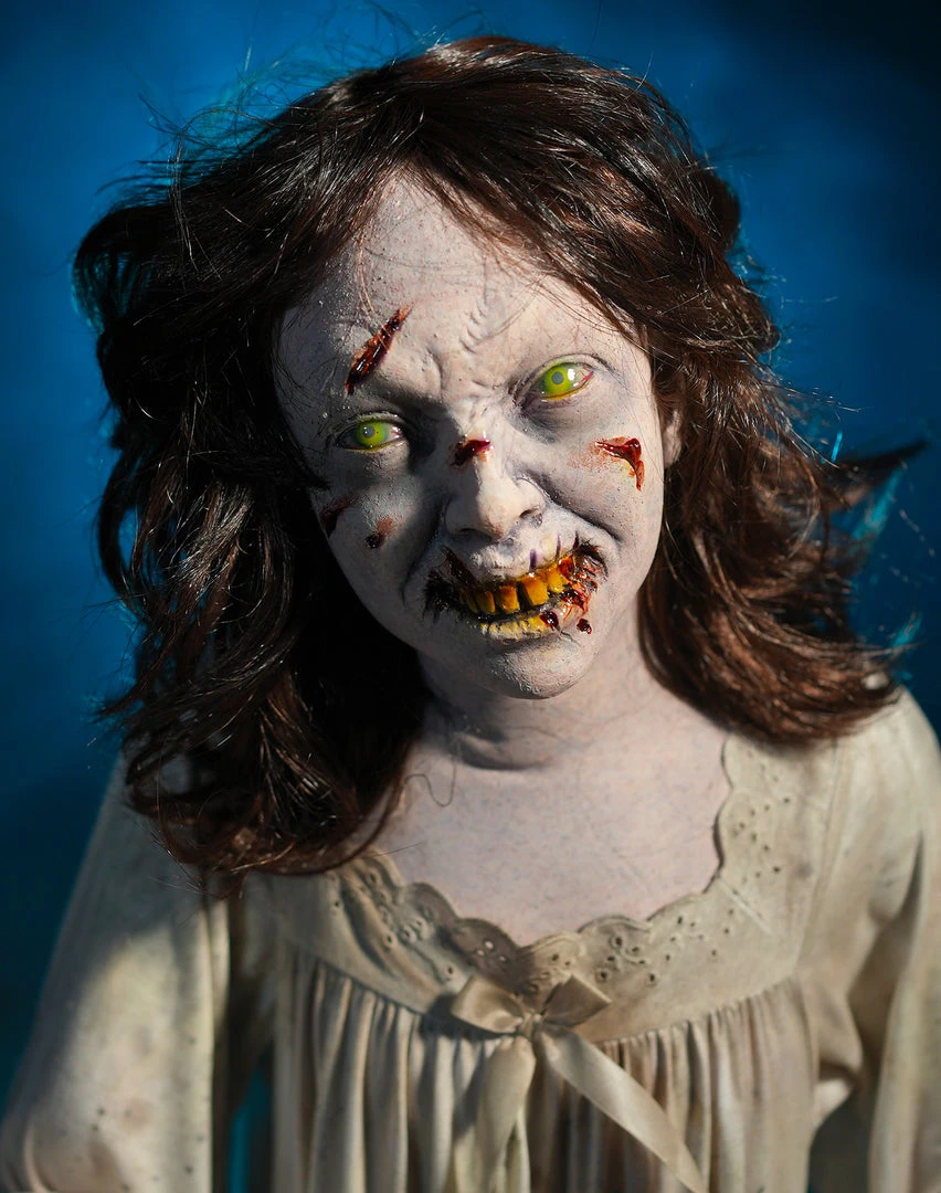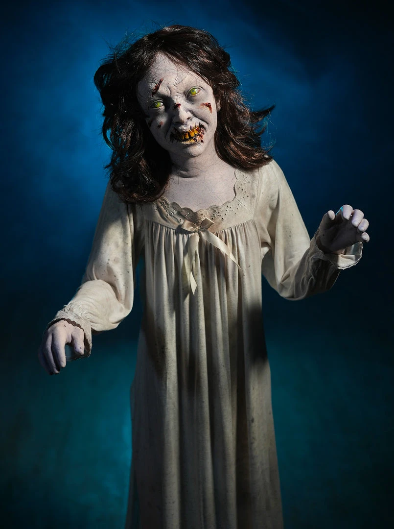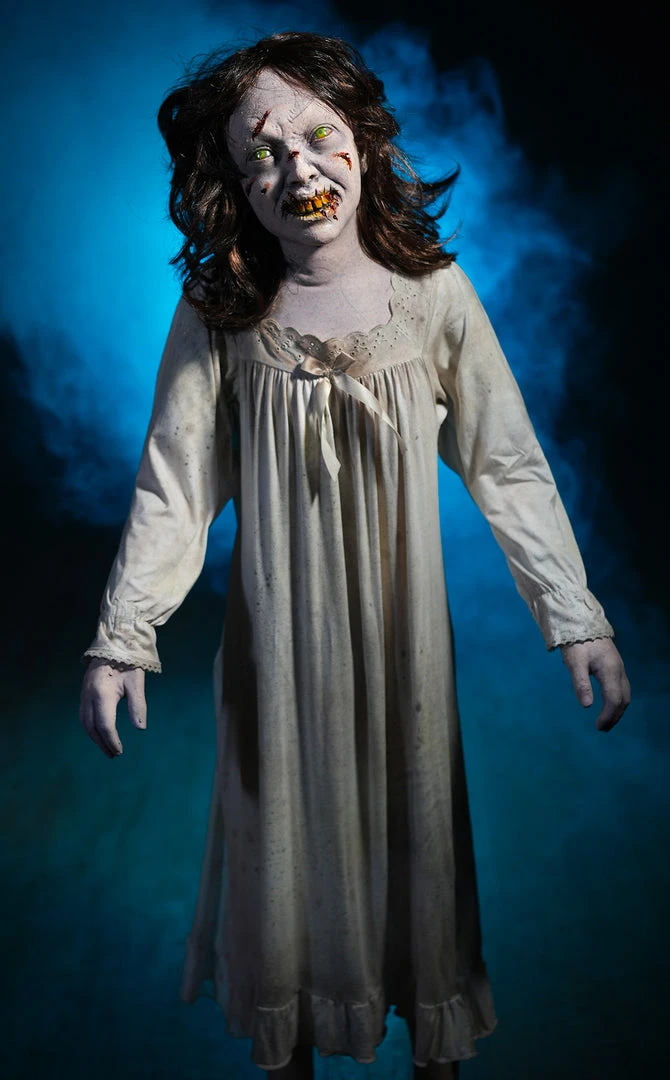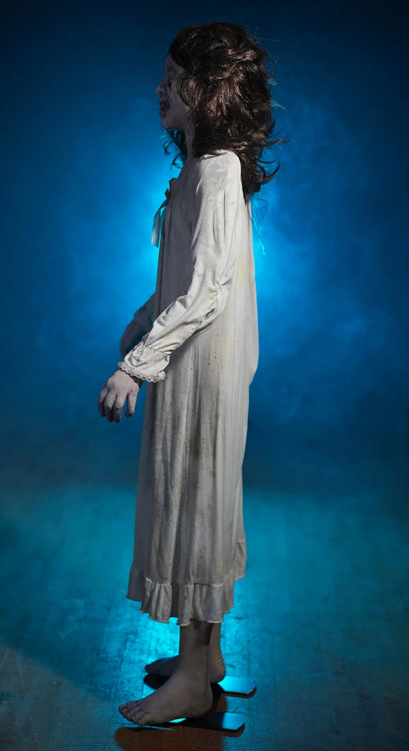 Affliction is a 4.5 ft. tall standing Halloween prop is an amazingly eerie demon possessed girl with disturbing smile. Crafted of latex, armature and foam filled, this is a perfect static prop for your yard haunt, home Halloween decorating, haunted house, or scary scene.