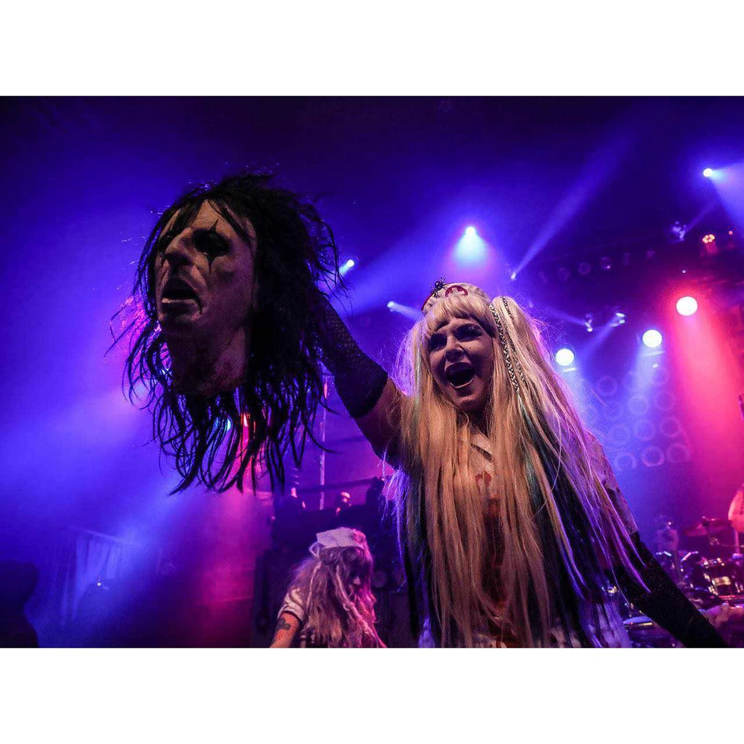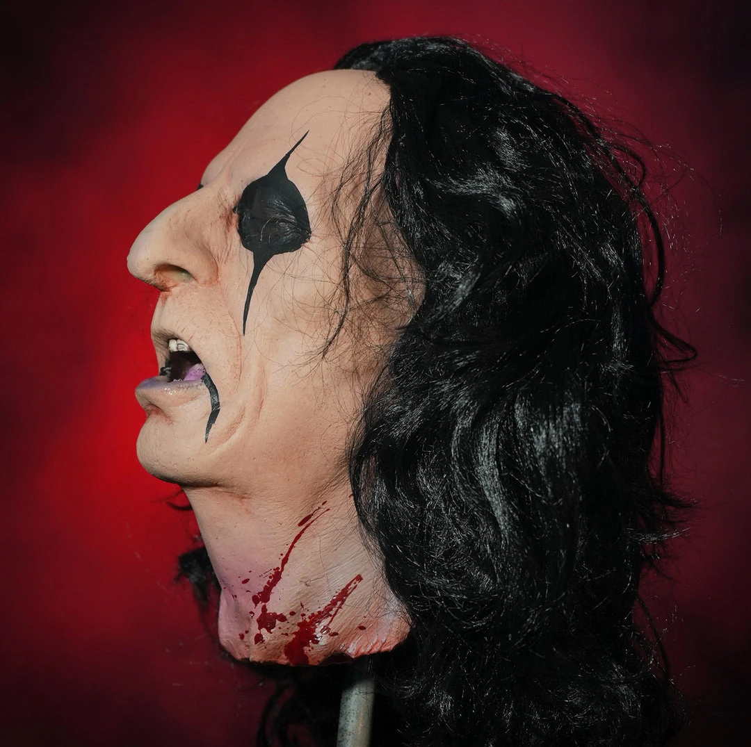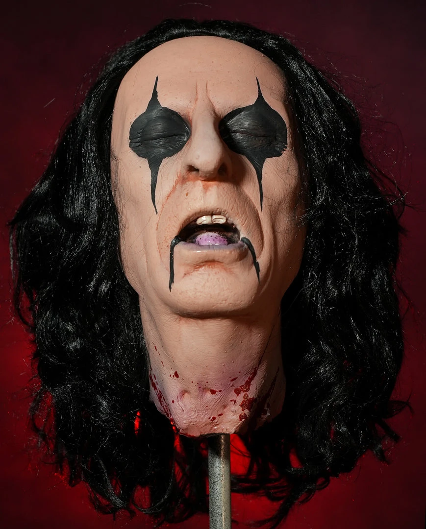 ALICE COOPER GUILLOTINE HEAD! This officially licensed Alice Cooper Head Prop is out of the same mold as the Guillotine Head used on stage. Collectors and Alice Cooper fans need this amazing piece! This severed head prop is expertly crafted and hand painted at Distortions Unlimited in the USA. Made of latex and foam filled.