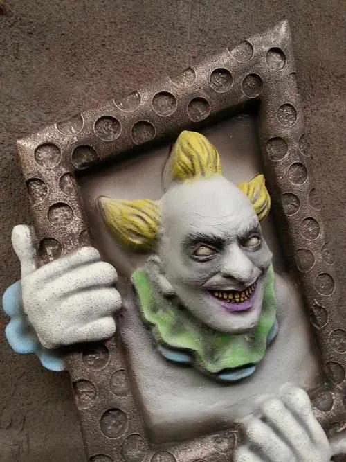 Creepy clown portrait is ready to hang. This high quality portrait prop is crafted of latex and foam prop is approx. 48 in. x 24 in. x 12 inches deep. Perfect for haunted houses, Halloween scenes, demented clown rooms and haunted mansions.