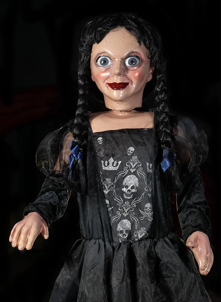 Dolly is a creepy doll Frightronic prop by Distortions Unlimited. Her head moves side to side, so creepy! Imagine this scary moving doll in your haunted toy room scene…or just put it in your house to scare people! Distortions makes Halloween dolls, animatronics, and haunt props for yard haunters, home haunters, dark attractions, and horror events. This scary doll caught on camera will have you running to hide! She could be a friend of Annabelle or Chucky! All electric fright prop ready to scare and creep out your guests. Made of Latex and foam with metal armature. Clothing may vary. Comes with link to downloadable audio.