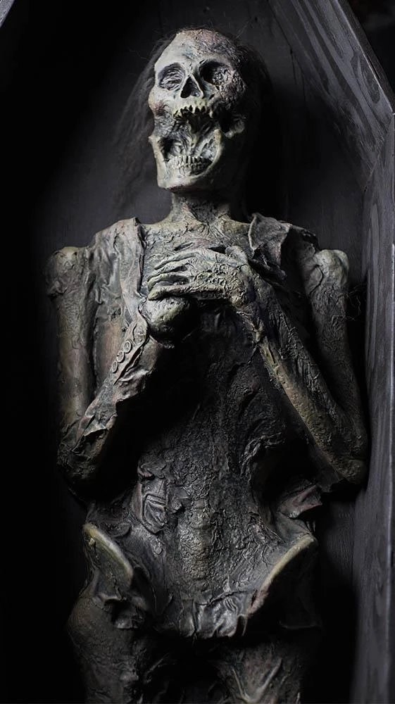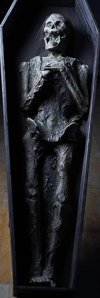 Death is a decomposing corpse Halloween prop made of latex and foam. This corpse prop has a realistic look and would be perfect for your spooky scene. Our professional Halloween props are used by haunted houses, home haunters and Halloween decorators around the world. It is flat-backed and approx. 63 inches long. It comes in two pieces, the upper body and lower body that fit together. This prop is made at Distortions Unlimited in the USA of quality materials. *Does NOT include coffin!