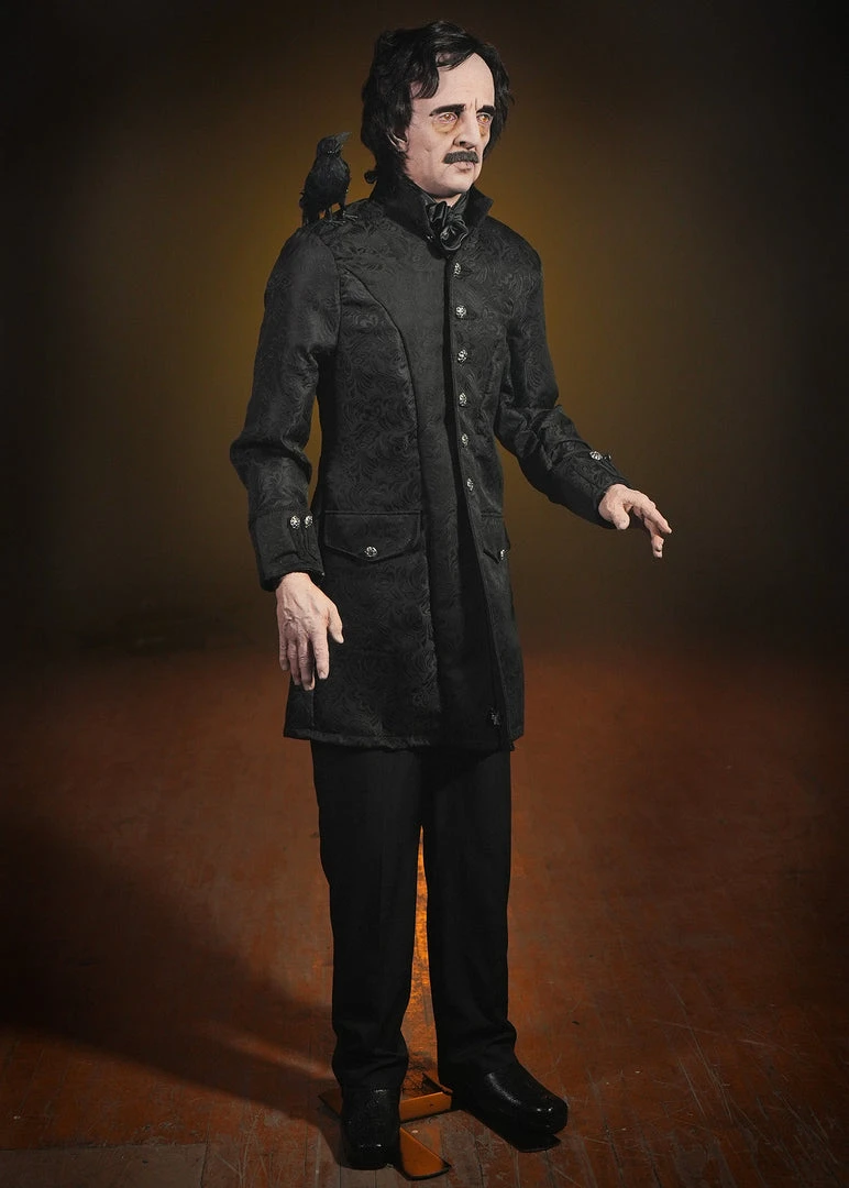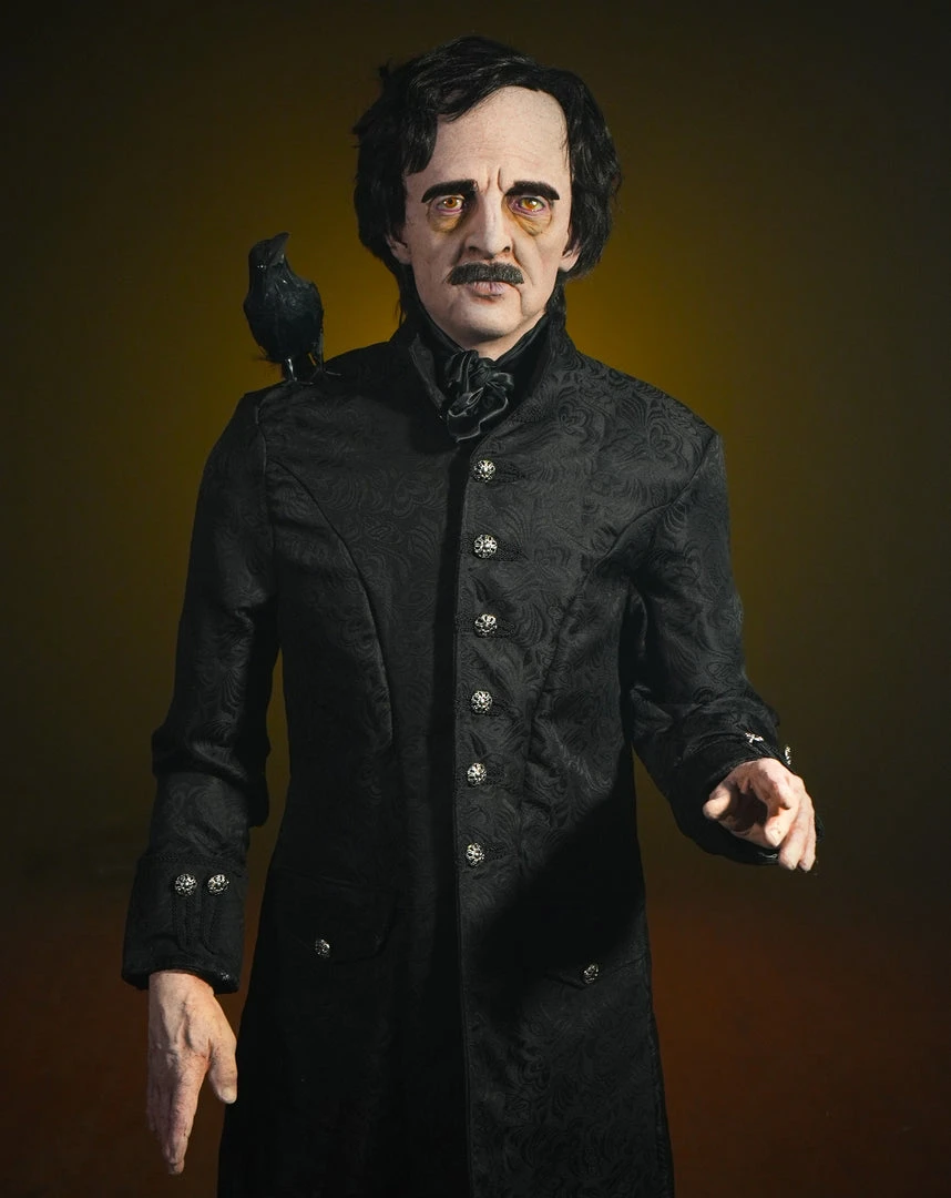 This quality Edgar Allan Poe standing prop display is new for Distortions Unlimited in 2021. Standing over 6 ft. tall this realistic sculpt is by Jordu Schell, and is hand crafted and painted at Distortions. Includes the bird on his shoulder! Perfect for fans, collectors and museums.