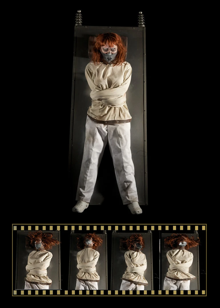 Krazy Kristen shakes violently! Insane animatronic prop for Halloween and haunted attractions. She goes crazy trying to escape her straight jacket. If you are looking for a high impact, durable animatronic for your haunted attraction, Halloween event, or even extreme home haunt Krazy Kristen might be the one for you!