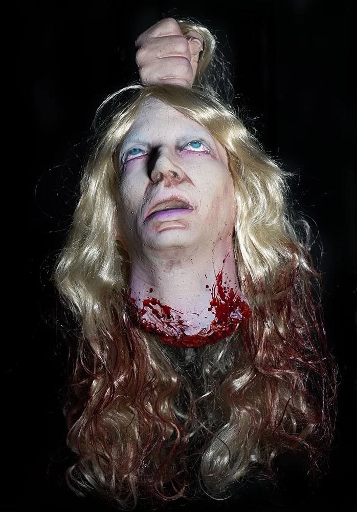 Helga Beheaded is a severed head illusion prop. This incredible gory prop is a perfect addition to a Halloween or haunted house actors costume. Your hand goes in the back of the head and your hand can open and close her mouth. Made of latex, foam, and hand painted.
