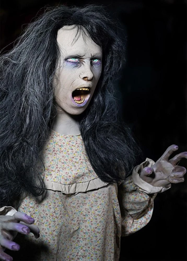 Nightfright is a creepy zombie girl Frightronic prop by Distortions. This all electric animatronic prop moves and shakes. Incredibly creepy addition to your Halloween or haunt scene. Our Halloween animatronics are made to last out of quality materials and are hand painted at Distortions Unlimited. Clothing may vary. Comes with audio download.