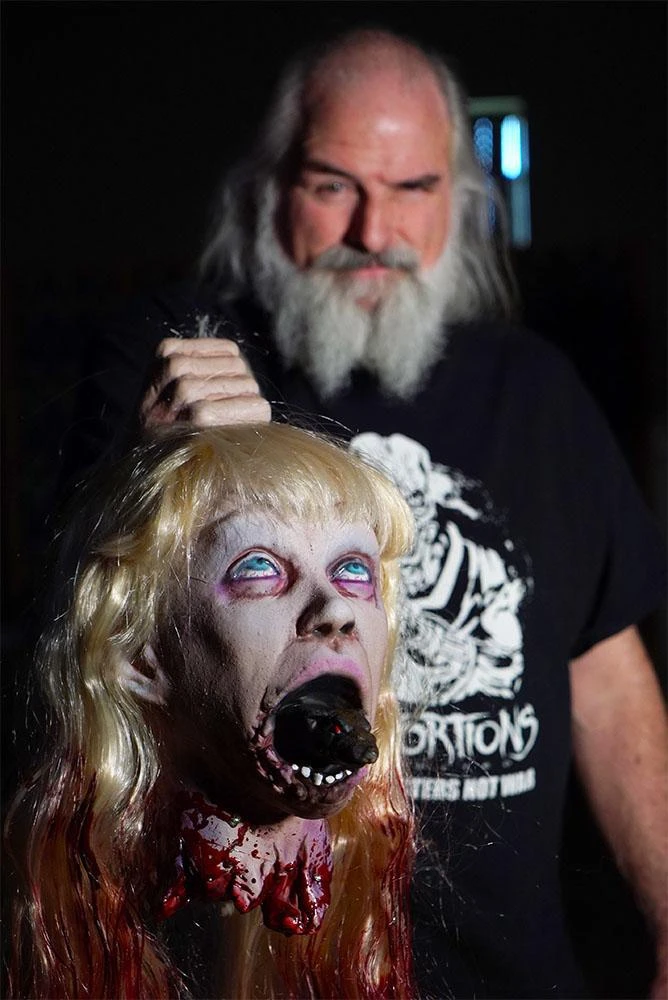 Rat Girl Beheaded puppet prop! Your hand goes in the back of the severed head prop and your hand can open and close its mouth, wiggling the rat in the head. Made of latex and foam, and hand painted here at Distortions Unlimited in the USA.