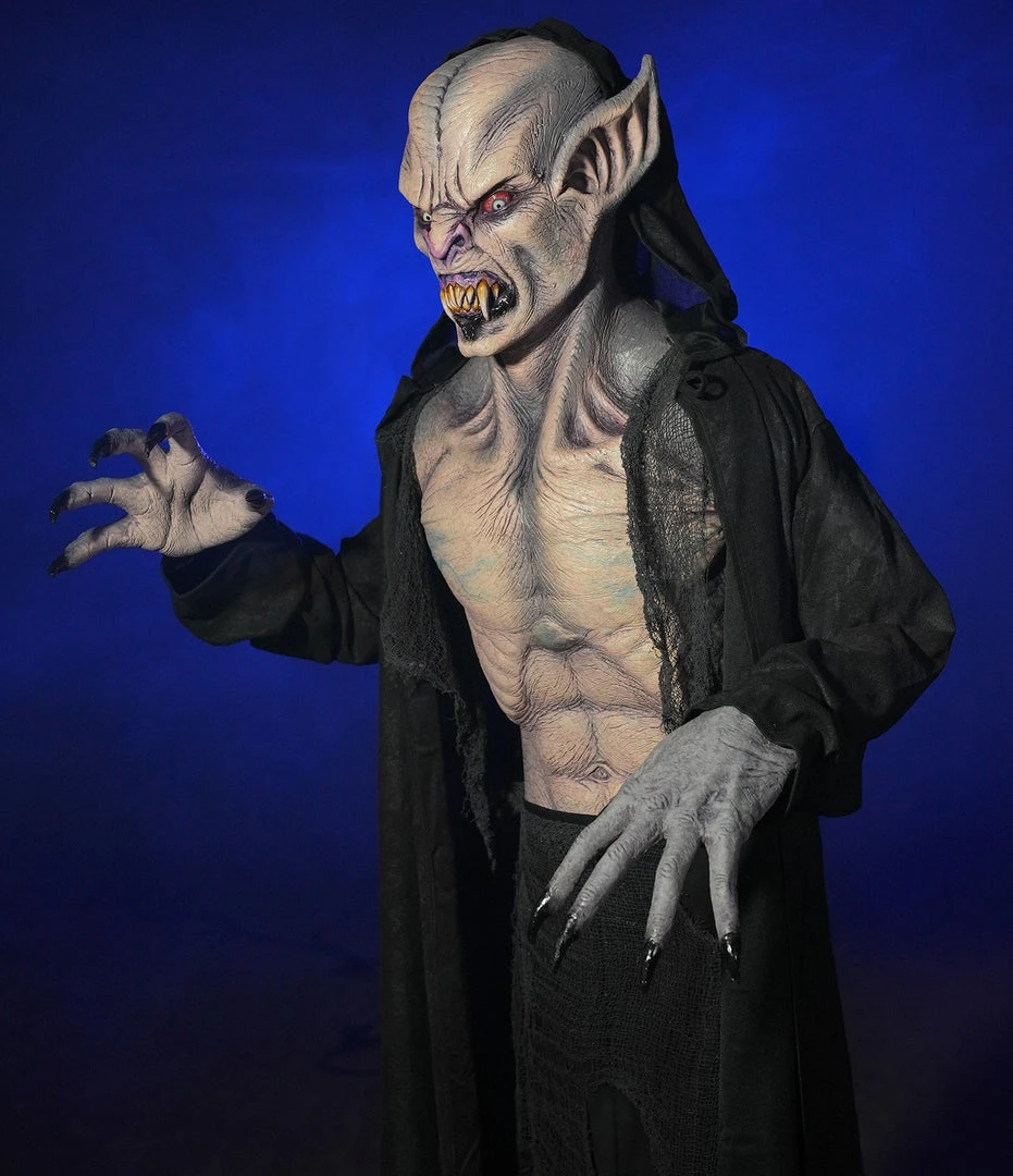 The Vampire Legend display prop towers at around 6 1/2 feet tall and is sure to impress! This expertly crafted standing vampire prop is ideal for vampire, horror, and Halloween lovers! Hand painted and made by Distortions Unlimited in the USA of latex and foam with an armature inside. Our life sized, blood thirsty vampire prop comes apart (in half) so that it can be transported and stored easily. Vampire Legend is flat backed but has cloth and clothing covering the back side. Bendable arms let you pose the character. It comes with a metal base to stand it on.
