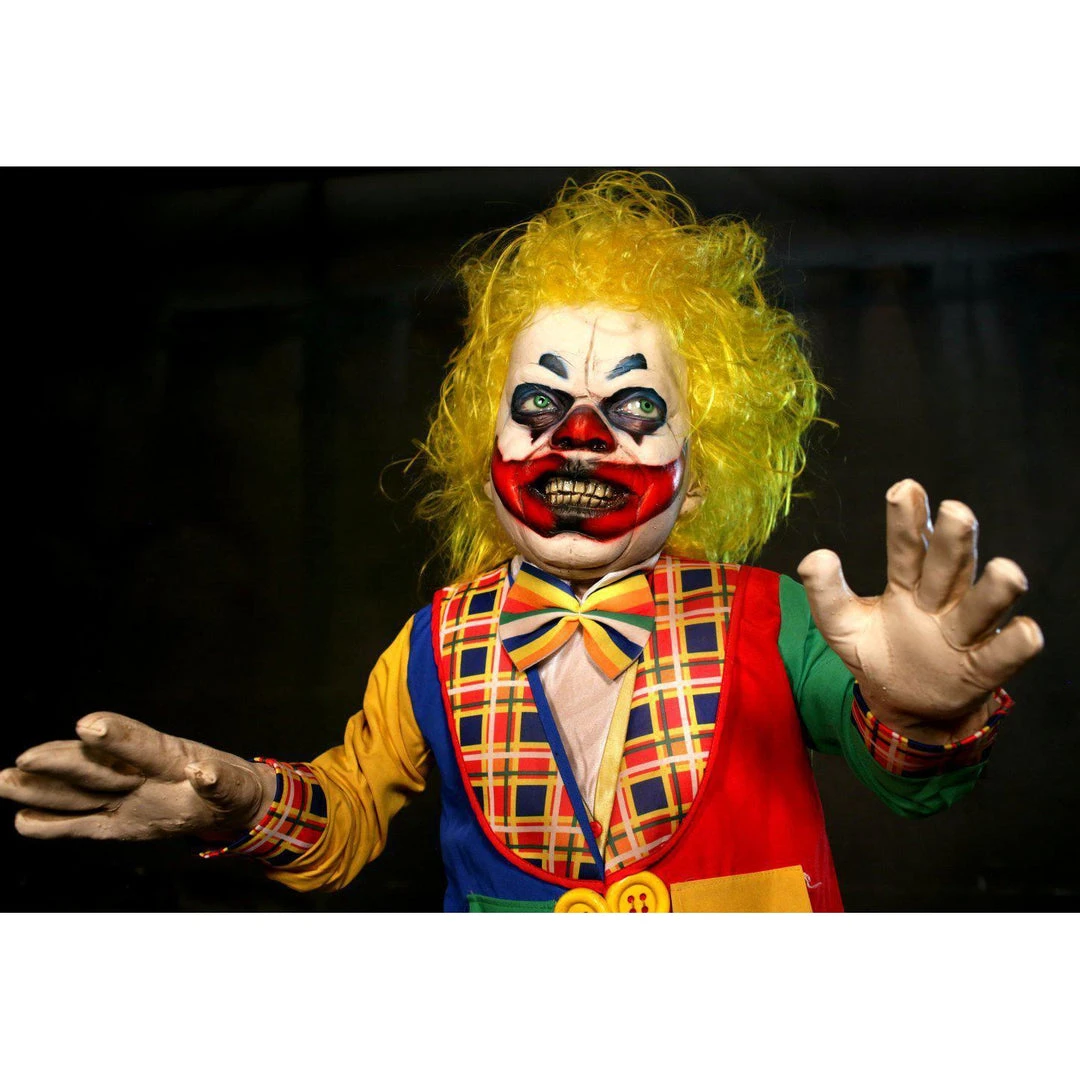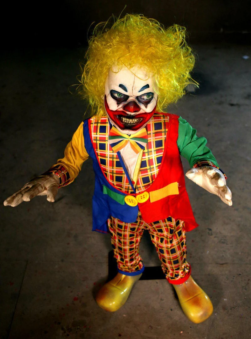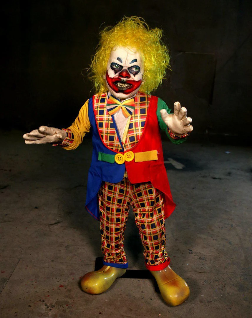 Whacko is one creepy little mini clown! This is the static prop version and does not include movement or sound. Made of foam filled latex and a metal armature and base this scary clown prop is hand painted and stands 48 inches tall. This little psycho clown is perfect for Halloween, Haunts, home haunters, retail stores, and clown, circus, and demented toy room scenes.